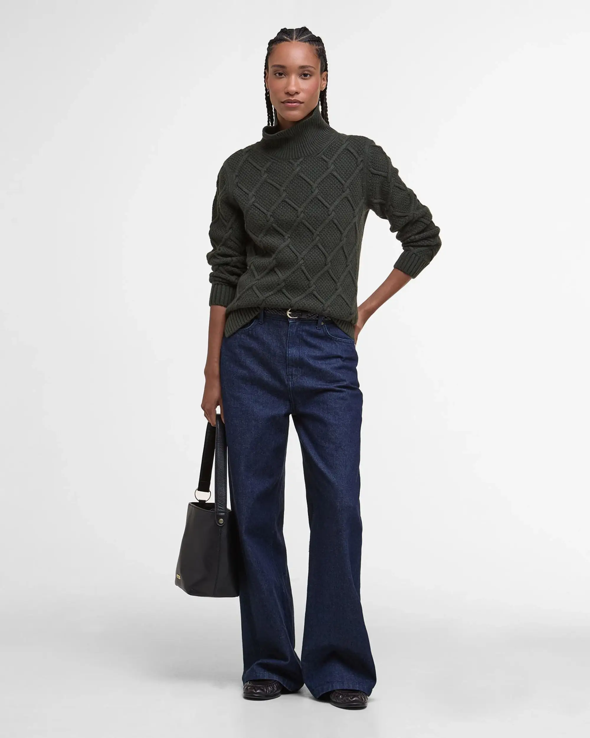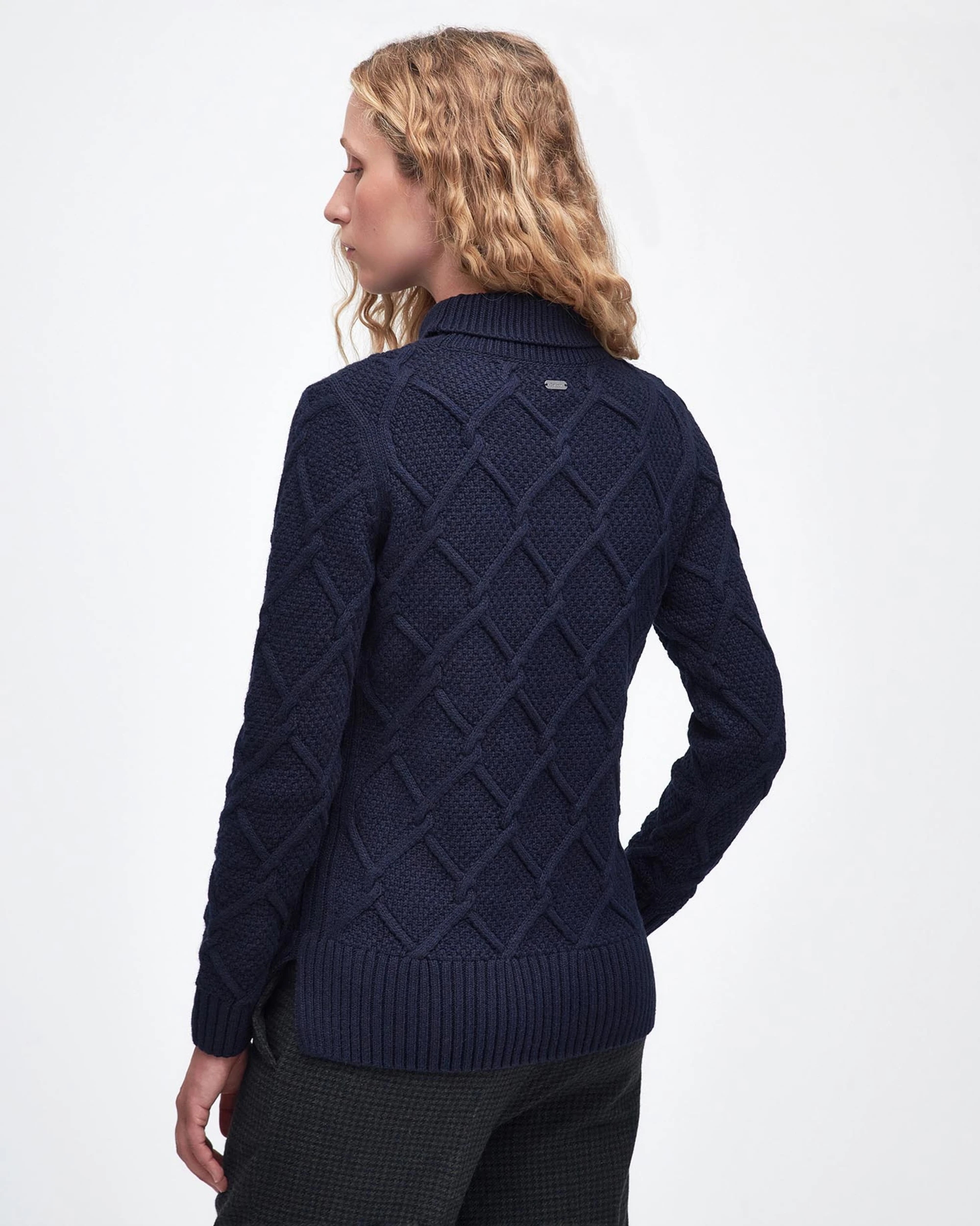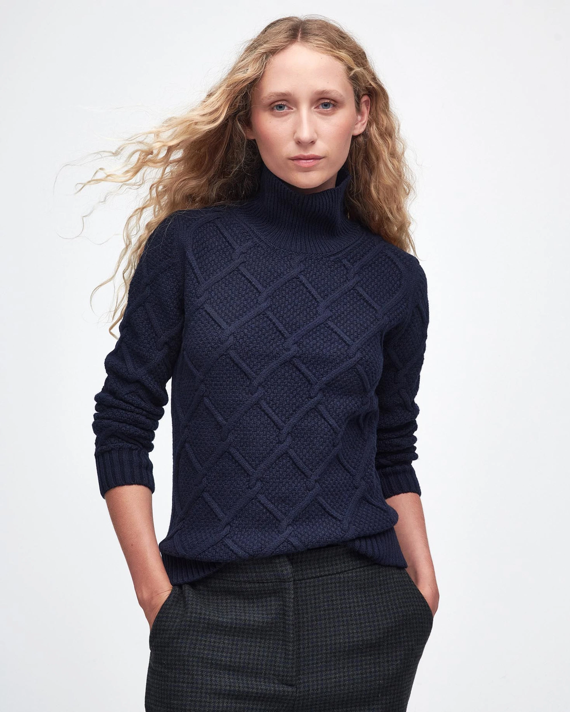 The Barbour Ladies Burne Roll Neck Knitted Jumper combines classic style with everyday comfort. Crafted from a warm blend of wool and cotton, it feels soft against the skin while keeping you cosy on cooler days. The elegant roll neck adds a touch of sophistication, and the argyle-inspired cable knit gives it a timeless, textured look.