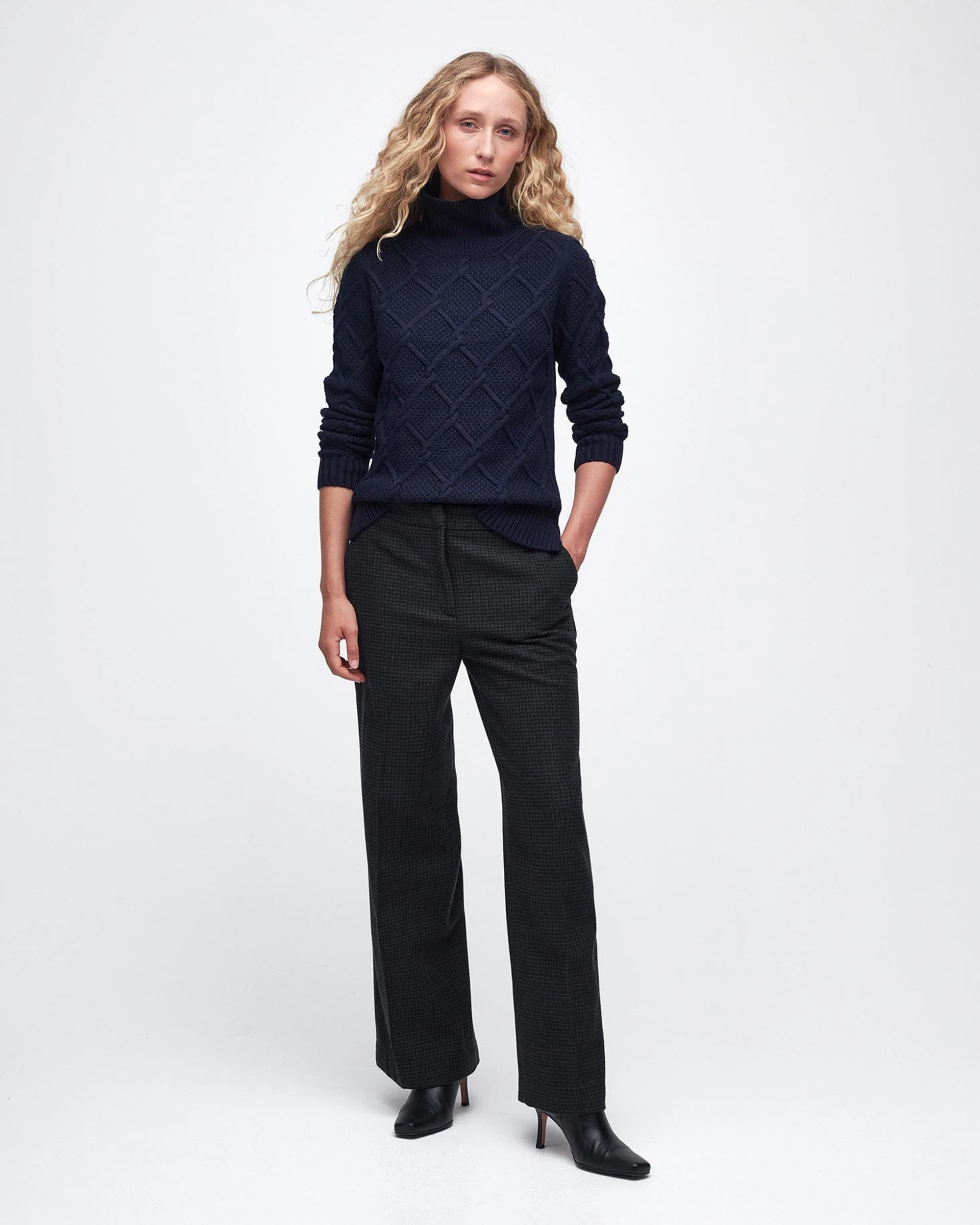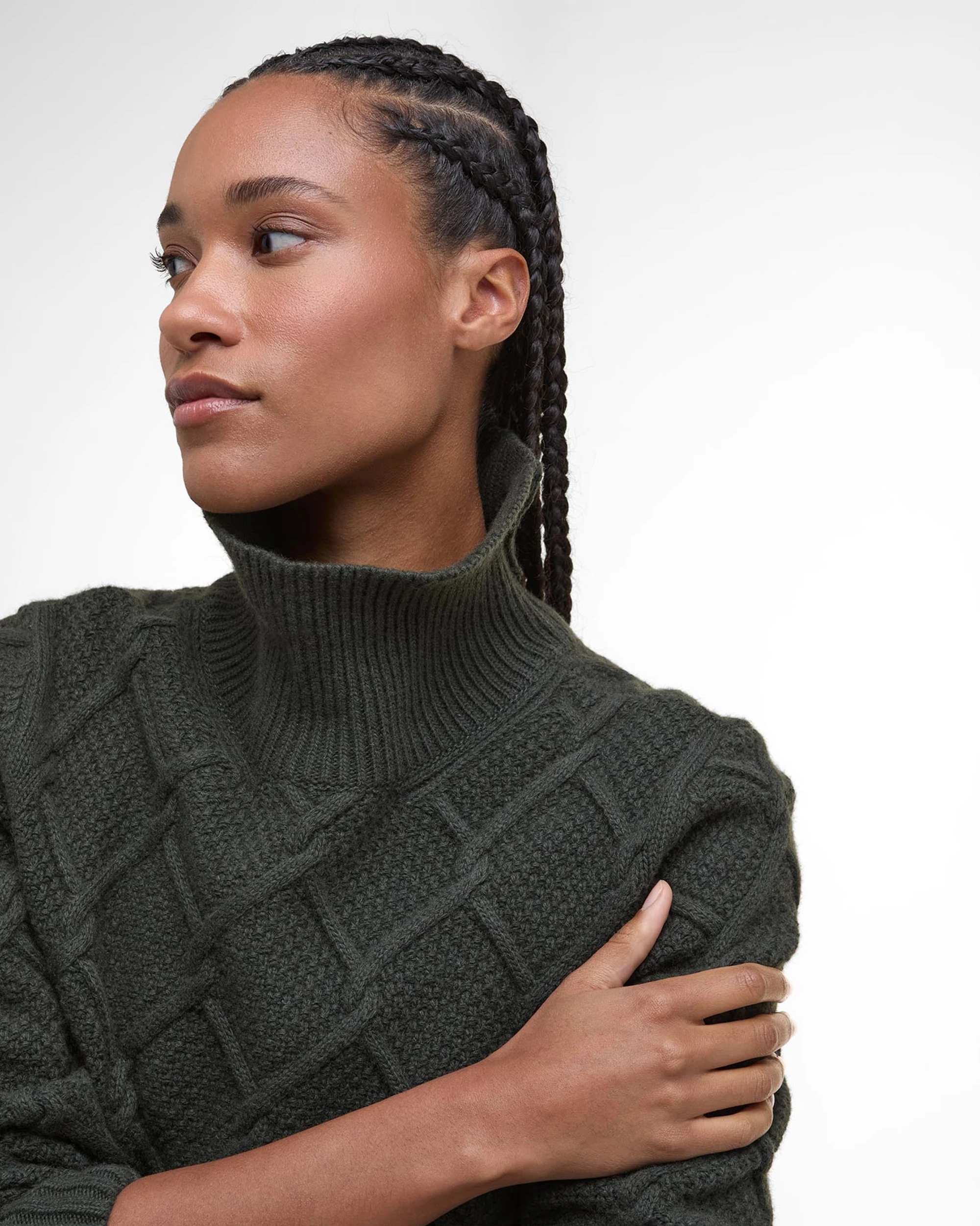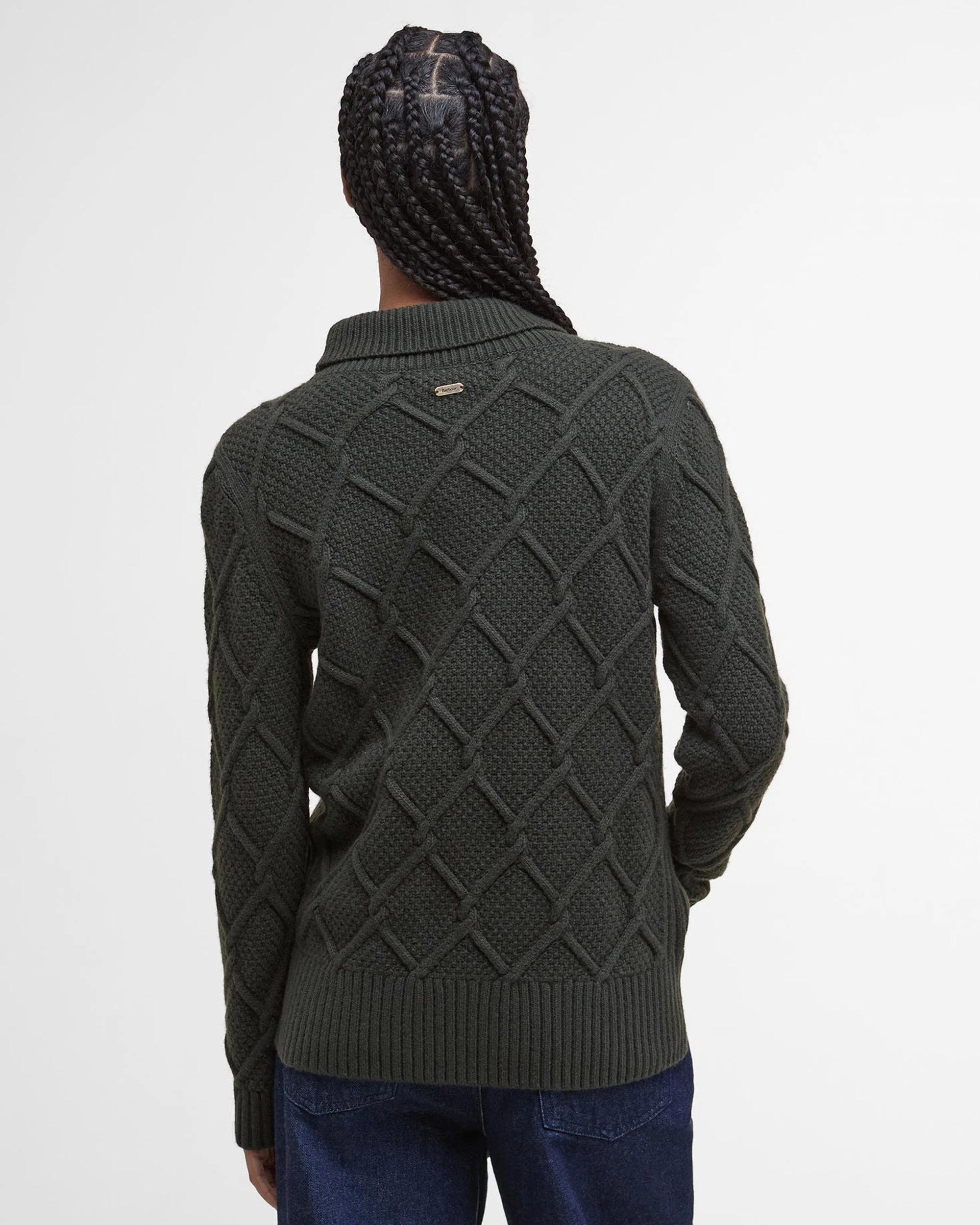 The Barbour Ladies Burne Roll Neck Knitted Jumper combines classic style with everyday comfort. Crafted from a warm blend of wool and cotton, it feels soft against the skin while keeping you cosy on cooler days. The elegant roll neck adds a touch of sophistication, and the argyle-inspired cable knit gives it a timeless, textured look.